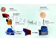 石料由振動給料機均勻地送到顎式破碎機進行粗破,粗破后的物料由膠帶輸送機送入到制砂機進行進一步破碎,細碎后的物料被輸送到振動篩進行篩分,達到成品粒度要求的物料被送入洗砂機清洗,清洗后由成品輸送帶輸出即為成品;未達到成品粒度要求的物料從振動篩返回制砂機重新加工,形成閉路多次循環。成品粒度可按用戶的需求進行組合和分級。如果選用干法生產工藝,可配備粗細粉分離機和除塵設備。詳細訪問http://www.bangmozhishaji.com